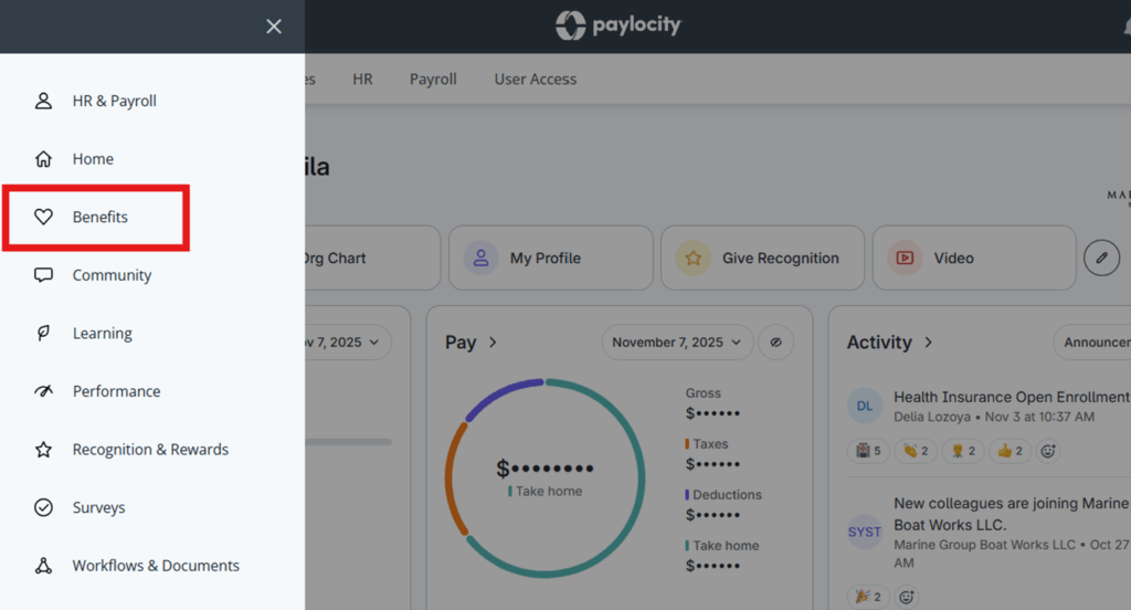 It’s time to choose your health benefits for the next year, so please sign in to Paylocity by Friday, Nov. 14 to select your preferences. HR is here to help with any broad benefit questions and can direct you to a benefits specialist for more in-depth questions. Please see the photo below for where to access the benefit section: